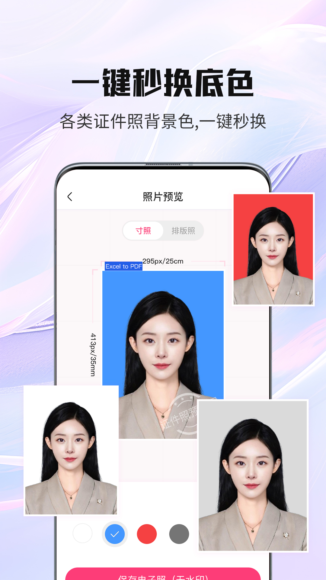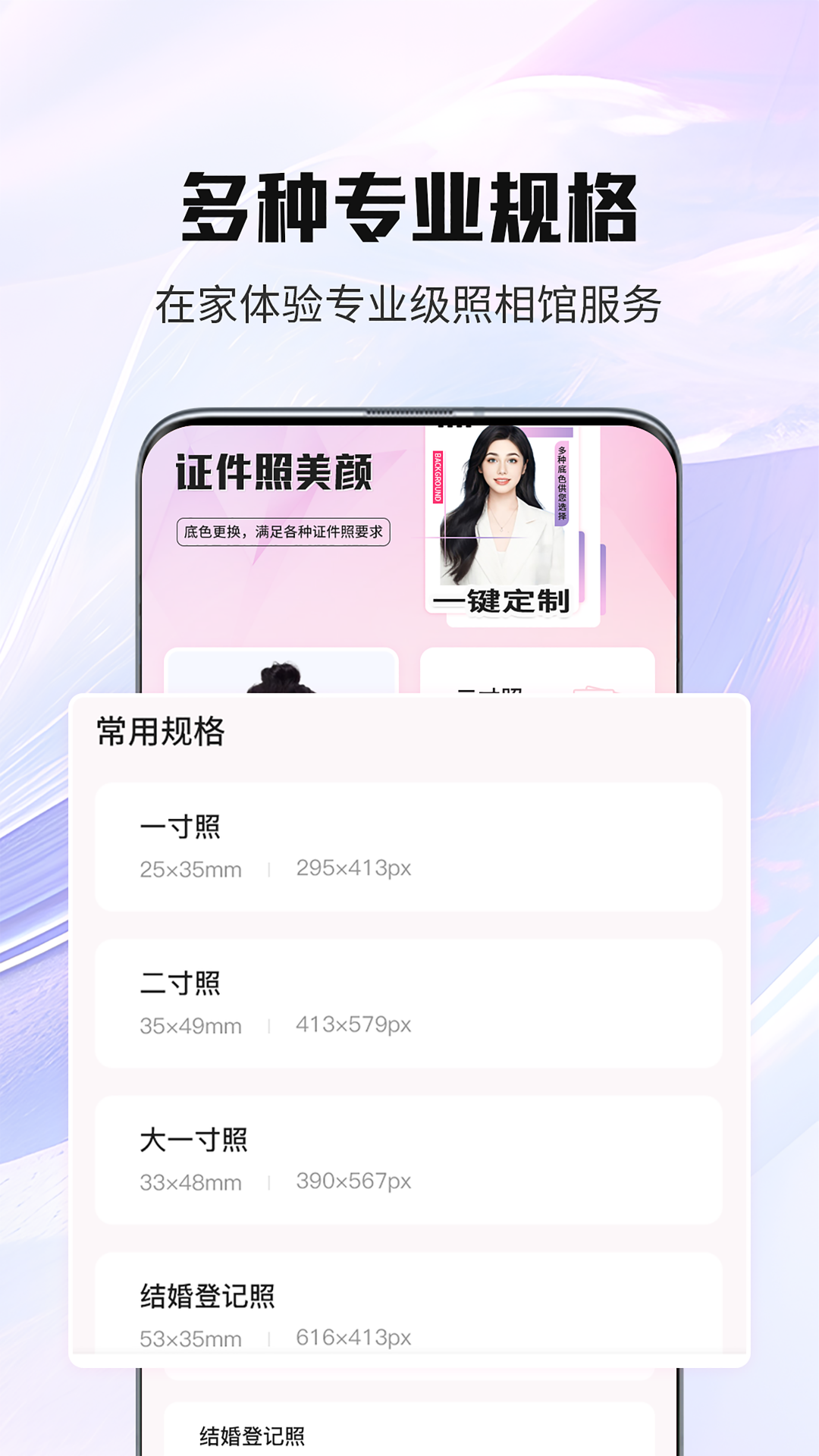 核心功能覆盖证件照制作全流程,包含智能尺寸库、背景替换、美颜优化与正装替换等模块。尺寸库全面涵盖常规一寸、二寸等基础规格,同时包含考试报名、职业资格、出国签证等百余种特殊证照规格,每种尺寸均严格参照官方标准设定。背景替换功能依托智能抠图算法,可精准分离人像与背景,支持红蓝白基础底色及糖果色等高级底色切换。美颜模块提供从基础肤色调整到五官精细优化的多层次处理,包括智能磨皮、肤色均衡、脸型微调及黑眼圈淡化等功能,确保美化效果自然不失真。