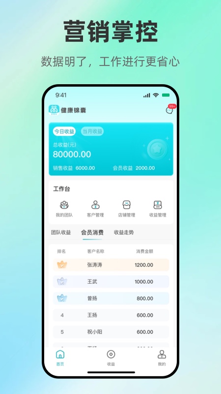 在应用介绍中,健康锦囊管理端囊括了从营销管控到团队协作的多种实用功能。它有一个创新营销管控服务平台,专注于药品销售的数字营销和渠道管理,帮助制定更精准的策略。行业研究功能深入分析市场趋势,让团队快速适应环境变化。还支持重构营销模式,利用大量市场数据评估并优化销售方式。实时掌握市场销售数据和变化,能让团队做出及时决策,而精细化管理和销售人员工作状态跟踪则通过后台数据帮助监督每个成员的表现,提供更好指导。数据智能功能依靠人工智能和机器学习辅助市场开发,提升整体效率。平台还整合了店铺管理、客户分类和收益统计等模块,例如将客户分为会员和普通类别,便于跟进交易,并直观展示收益走势,让数据一目了然。移动办公能力也让团队随时随地处理事务,提升灵活性。