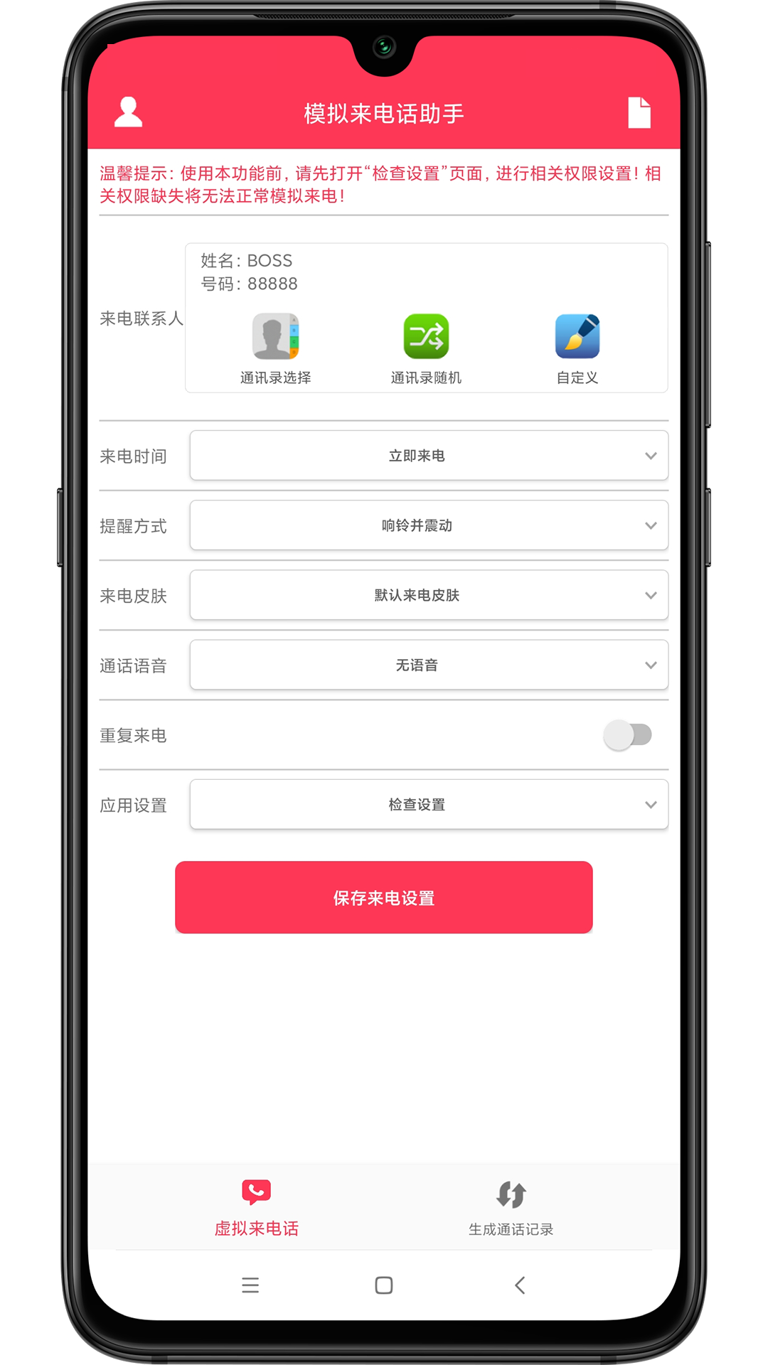 模拟来电话助手是一款功能实用且操作便捷的手机应用程序。它为用户提供模拟来电的功能,帮助用户摆脱各种尴尬或不便的场景。无论是想要从冗长的聚会中脱身,还是需要在某些场合中制造来电的假象,这款软件都能轻松满足需求。软件界面简洁明了,易于上手,即使是初次使用的用户也能快速掌握其操作方法。它还具备高度的自定义性,用户可以根据自己的需求设置来电的时间、号码、铃声等参数,让模拟来电更加真实可信。