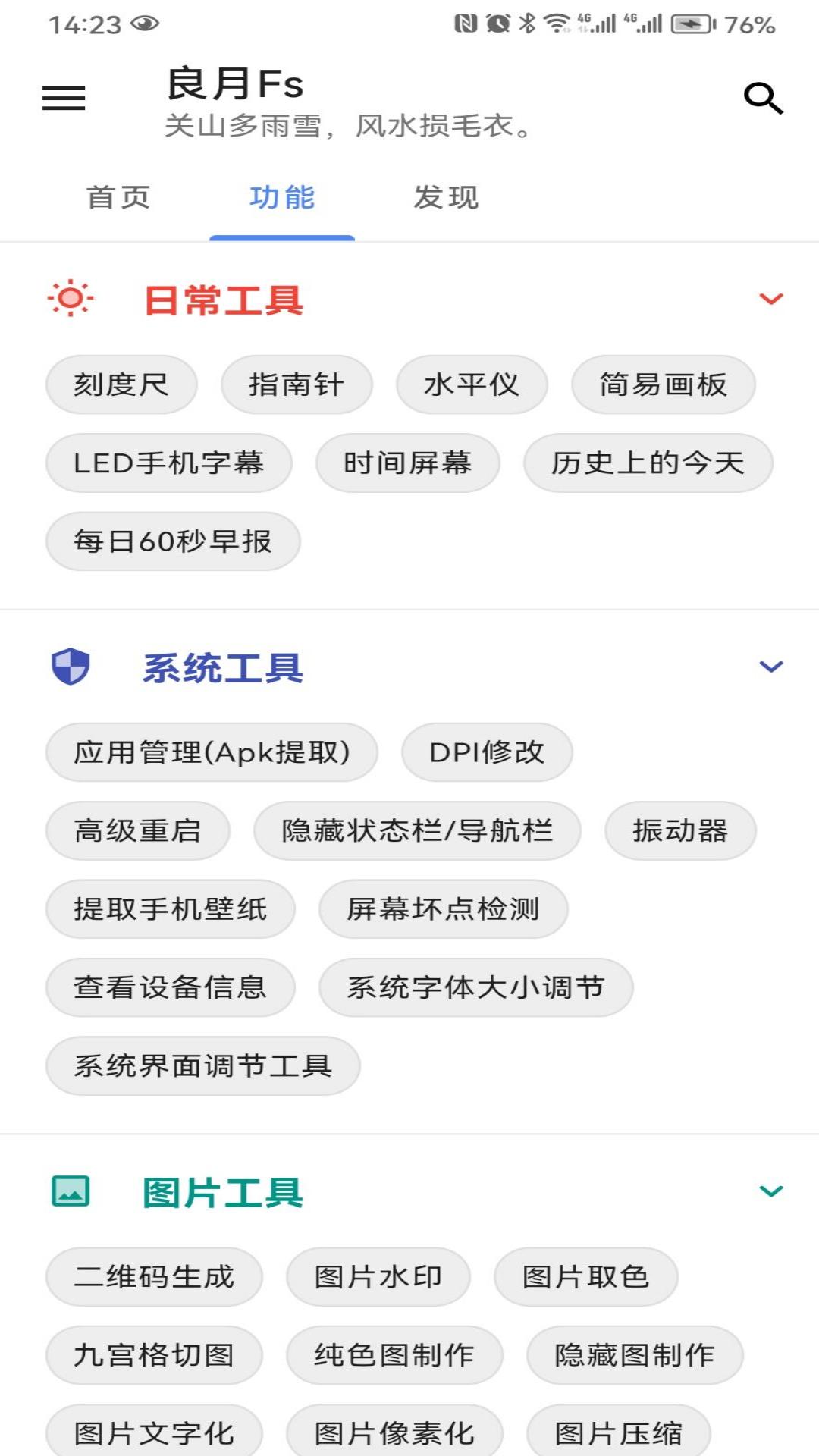 良月fs的亮点在于它的多功能集成和隐私保护能力。工具合集里包含水平测量、图片编辑等实用小功能,比如水平仪能精准测量物品尺寸,图片工具则自带滤镜和贴纸,让日常操作更趣味化。界面无广告设计,清爽简洁,使用起来毫无干扰。亮点还体现在个性化定制上,你可以一键操作常用工具,根据需求调整设置。许多用户爱它的实时监测提醒,比如流量统计和病毒扫描,帮你防患于未然。