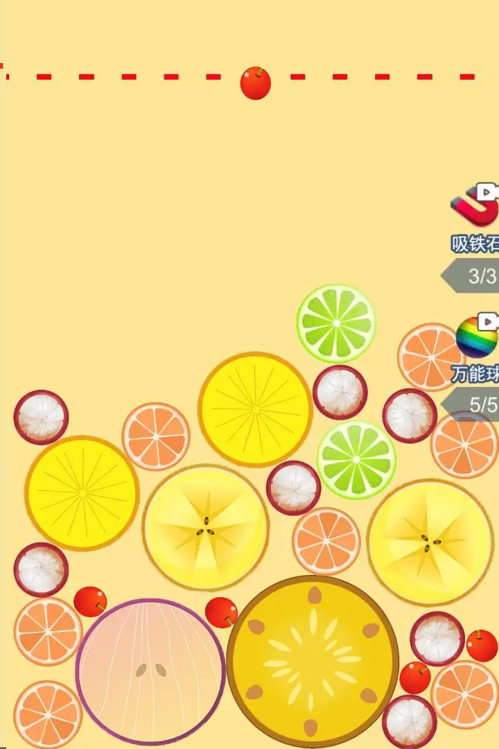 进入游戏后,画面上方会不断掉落各类水果,玩家通过左右滑动调整落点,相同水果碰撞后自动合并升级。界面上方有一条虚线警戒线,水果堆超过这条线就会判定失败。游戏分普通关卡、限时挑战、无尽模式三类,普通关卡有明确目标,比如合成两个椰子、累计一万分,完成就能解锁下一关;限时模式要在规定时间内尽可能合成高分;无尽模式没有关卡限制,一直合成直到水果堆满,挑战最高分数。养成线围绕道具和场景皮肤展开,用合成获得的金币解锁肥料、加速等道具,也能更换果园背景,让画面更有新鲜感。