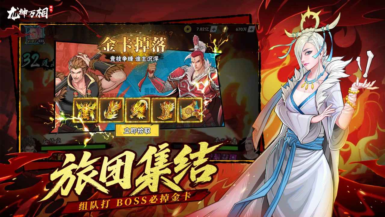 每张卡牌都拥有独特的技能和属性,我们可以通过进阶和培养来组建自己的最强阵容,应对各种挑战。任务系统丰富多样,完成日常活动、寻经任务等能获得丰厚奖励,帮助我们快速提升实力。闯关模式设计精彩刺激,我们需要面对不同难度的敌人,逐步解锁高级关卡,考验战术思维和临场应变。这部作品还加入了挂机收益功能,即使离线也能自动收集资源和经验,解放双手,适合利用碎片时间娱乐。PVP和PVE玩法齐全,包括巅峰竞技、龙神八部、修罗来袭等模式,提供多样化的对战体验,让每次冒险都充满变数和乐趣。