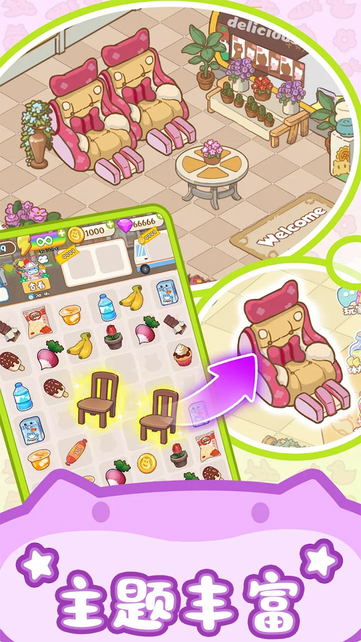 核心玩法是魔性上瘾的合成机制,两包小薯片能合成家庭装,两瓶牛奶变成大桶装,最高能合成闪着钻石光的限量版商品。商品种类超丰富,涵盖零食饮料、玩具化妆品等12大类300多种。装修自由度很高,能选复古杂货铺或未来科技风等20多种主题,货架和收银台都能360度调整。每天登录送熊猫快递员,点它7次会掉落稀有商品。小游戏系统包含管道连接、青蛙跳荷叶等5种迷你游戏,通关送加速道具。最有趣的是顾客会突发奇想要情人节礼盒或生日蛋糕,临时合成应对特别有成就感。
