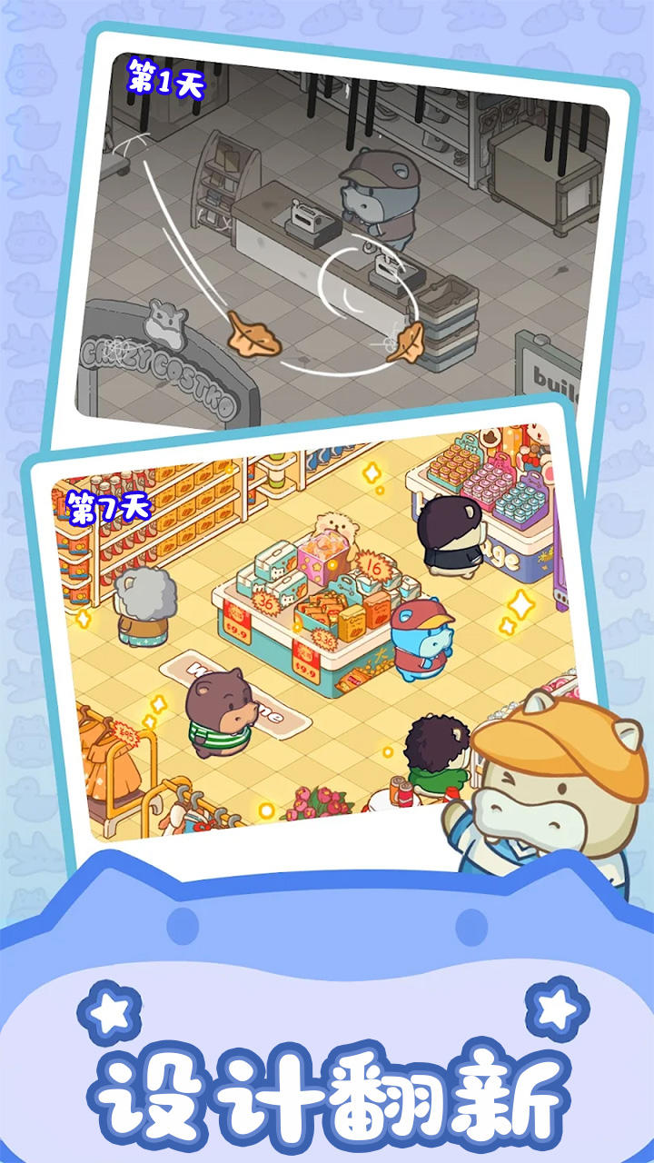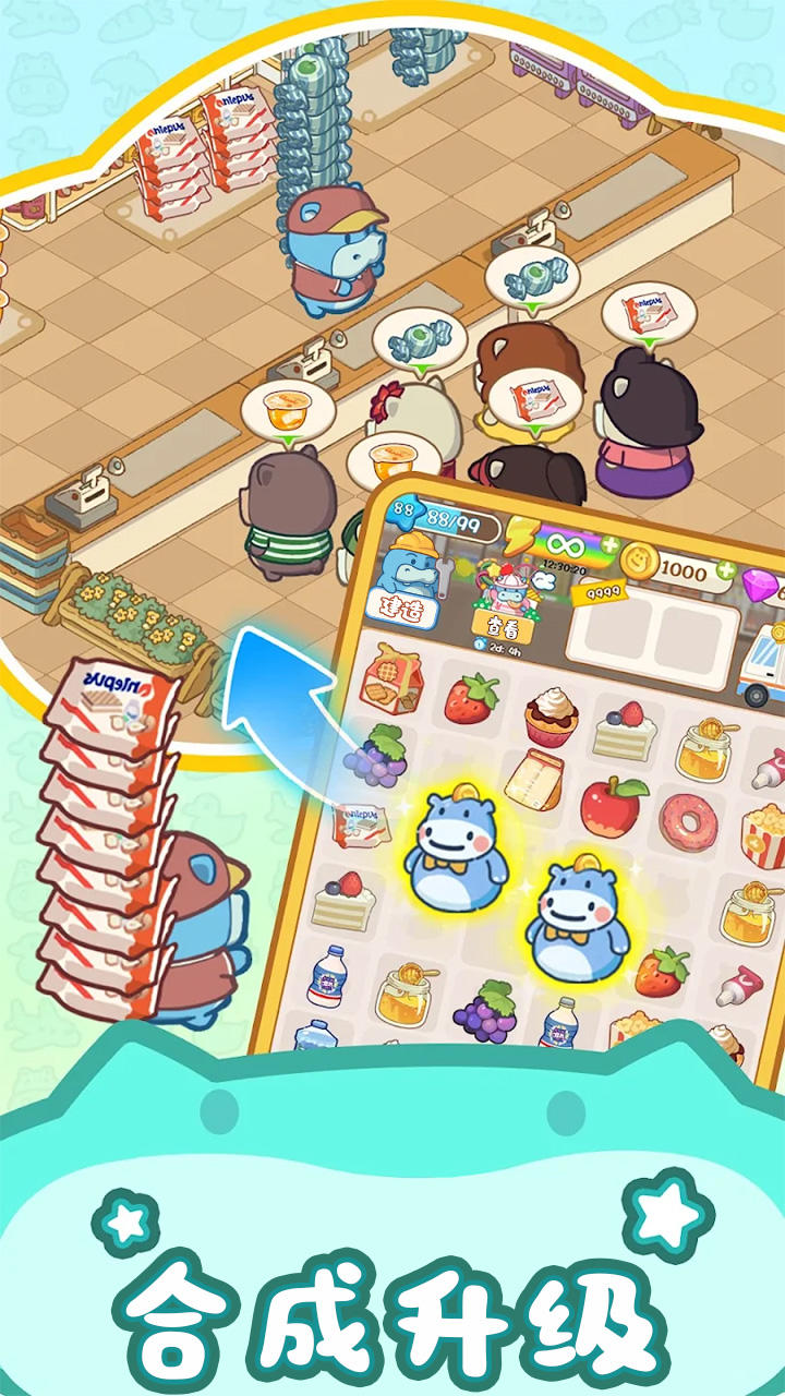 这是一款让你体验从零开始经营超市的休闲手游,主角是一只梦想开超市的呆萌小河马,需要你帮忙从空荡荡的货架起步。通过合成商品、完成订单、装修店铺,最终打造全球连锁超市帝国。游戏把合成消除和模拟经营巧妙结合,画风Q萌治愈,操作简单但策略性强,特别适合利用碎片时间享受当超市大亨的成就感。
