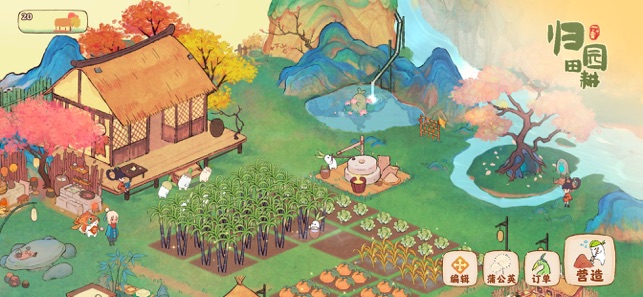 游戏核心围绕归园田居展开:玩家需开垦梯田种植农作物,建设谷仓、厨房、染坊等生产设施,并利用资源完成村民订单。等级提升,逐步解锁钓鱼、制陶、弹琴、观星等古风活动。剧情主线贯穿萝卜洞秘境探索,玩家可体验周瑜小乔、鲁班等历史人物的故事副本,参与盗宝寻簪、机关解谜等任务。社交层面支持邀请村民共进晚餐、赠送手信提升好感,或通过萝萝牌斗兽棋等游艺玩法与其他玩家互动。