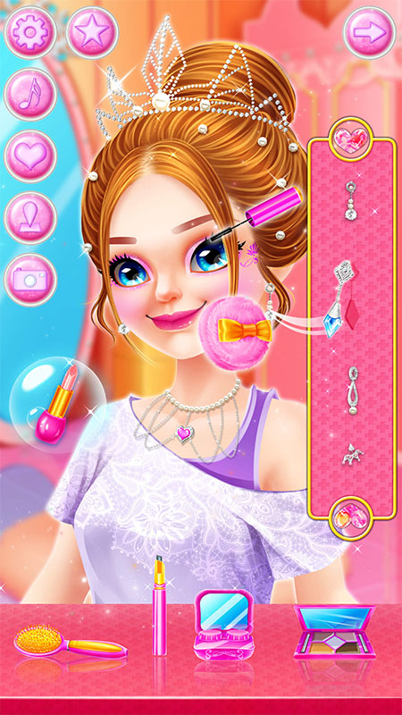 最吸引人的是海量装扮选项——光是婚纱就有蓬蓬裙、鱼尾裙等十多种款式,首饰盒里装满水晶王冠、珍珠项链等闪亮配件。化妆台上有真实的美容步骤:先给公主做皮肤清洁,再涂粉底、画眼影,最后涂上蜜桃色唇彩。场景布置也超丰富,每种场地都有配套的桌椅、灯饰和花艺装饰。特别贴心的是所有操作都有引导箭头,点哪里就能玩哪里,完全不用担心不会操作。